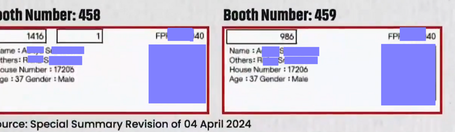 here’s a voter whose name appears on two different booths. this is a proof of inadequate data deduplication. i have not shown their name, and identifying information that can matter. you could argue whether more or less redaction makes sense, but this conveys the point.