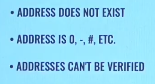what makes an address invalid? methodology is here. an empty or dummy address is easy to filter, but what about verification? who is doing the verification? is failing verification negatively or positively judged? who is “verifying” these addresses? i will give him the benefit of doubt and assume his research team went to every address and checked if they could find a house there.