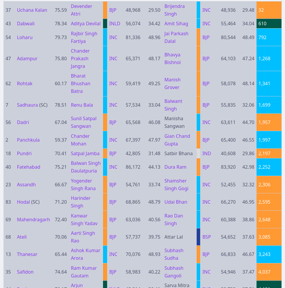 here’s a table of districts with the narrowest margins by number. Blue last column indicates an INC victory. this sure makes his case much weaker, given that he never gave any proof of /which side/ said fake voters are voting, and he’s transferring the example from another state.